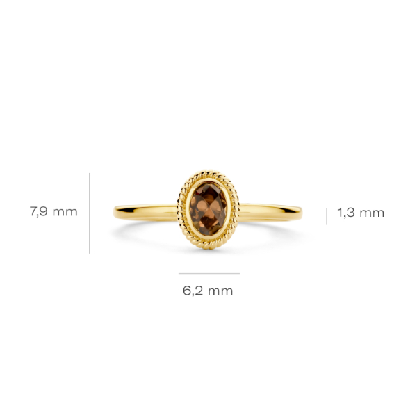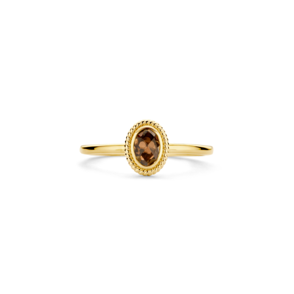 Deze ring van Blush is gemaakt van 14k geelgoud met een parelmoer en pure quartz. De ring heeft een diameten van 1,3mm. De ring is gezet in een gladomzetting met een speels kabelmotief.