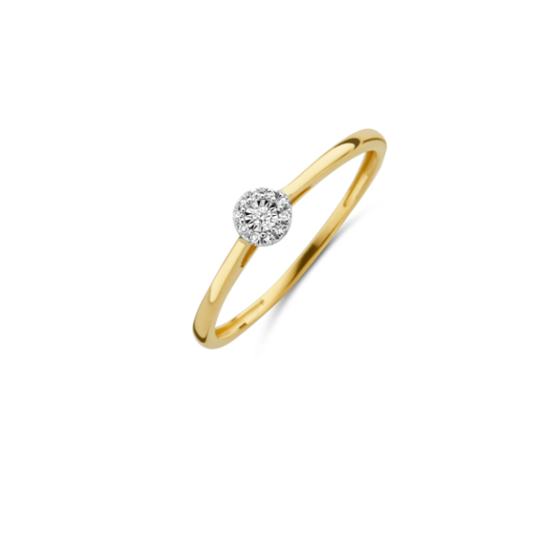 De geel en witgouden ring van 14 karaats is prachtig afgewerkt door de 0,15 karaat aan diamant die op de ring verwerkt is.