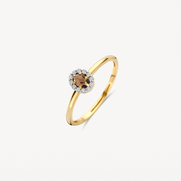 Deze schitterende ring van Blush is gemaakt van 14 karaats geelgoud en is afgewerkt met rook quartz en zirkonia.