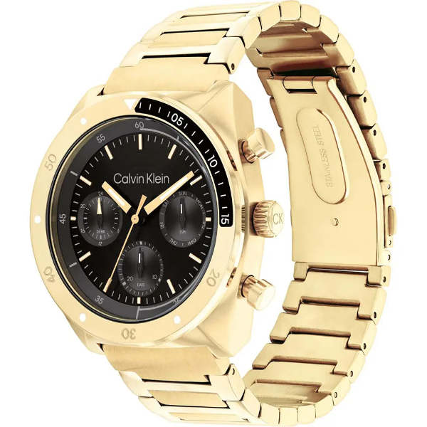Dit stijlvolle Calvin Klein horloge heeft een edelstalen horlogeband in combinatie met een 42 mm edelstalen kast. De zwarte wijzerplaat is afgewerkt met goudkleurige indexen. Het horloge is waterdicht tot 5 atm, wat het spatwaterdicht maakt.