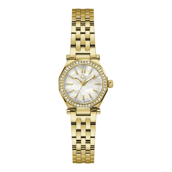 Dit stijlvolle horloge van de Guess Collectie, is gemaakt van edelstaal en is goudkleurig. De wijzerplaat is afgewerkt met een parelmoeren kleur in combinatie met zirkonia indexen. Het horloge is waterdicht tot 10 atm, wat het geschikt maakt om mee te zwemmen.