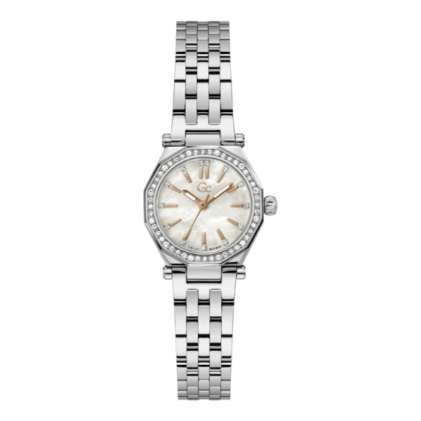 Dit stijlvolle horloge van de Guess Collectie, is gemaakt van edelstaal en is zilverkleurig. De wijzerplaat is afgewerkt met een parelmoeren kleur in combinatie met zirkonia indexen. Het horloge is waterdicht tot 10 atm, wat het geschikt maakt om mee te zwemmen.