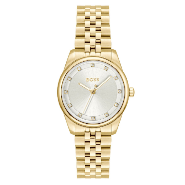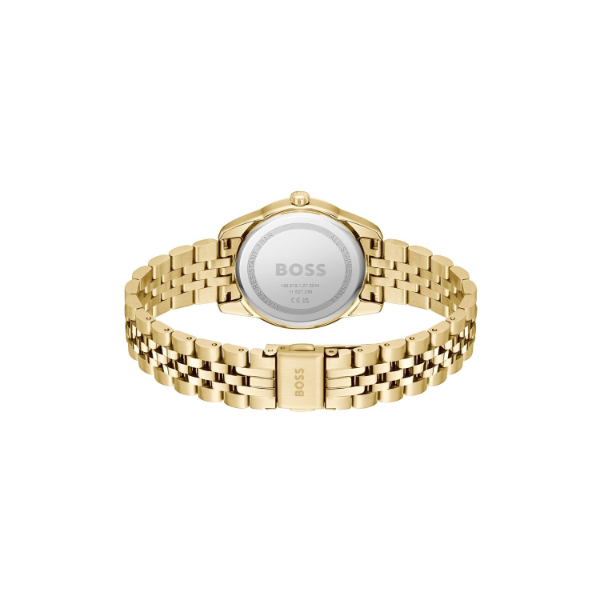 Deze Hugo Boss beschikt over een edelstalen band in combinatie met een edelstalen kast die beide goudkleurig zijn. De stijlvolle zilverkleurige wijzerplaat is afgewerkt met zirkonia uurmarkernigen. Het model is waterdicht tot 3 atm.
