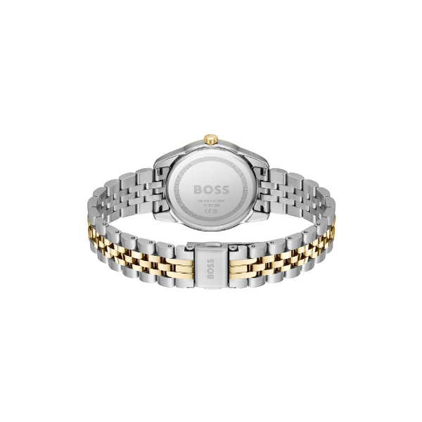 Deze Hugo Boss beschikt over een edelstalen band in combinatie met een edelstalen kast die beide goudkleurig zijn. De stijlvolle zwarte wijzerplaat is afgewerkt met zirkonia uurmarkernigen. Het model is waterdicht tot 3 atm.