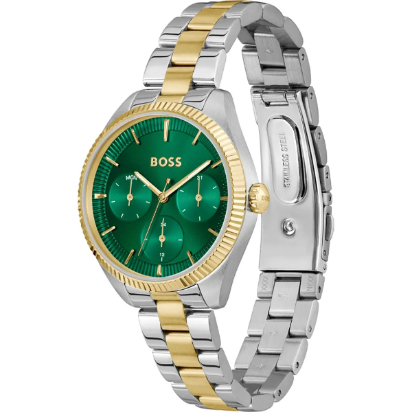 Dit Hugo Boss dames horloge beschikt over een bicolor gekleurde edelstalen band in combinatie met een stijlvolle groene wijzerplaat. Het horloge is waterdicht tot 3 atm, wat betekent dat het horloge spatwaterdicht is.