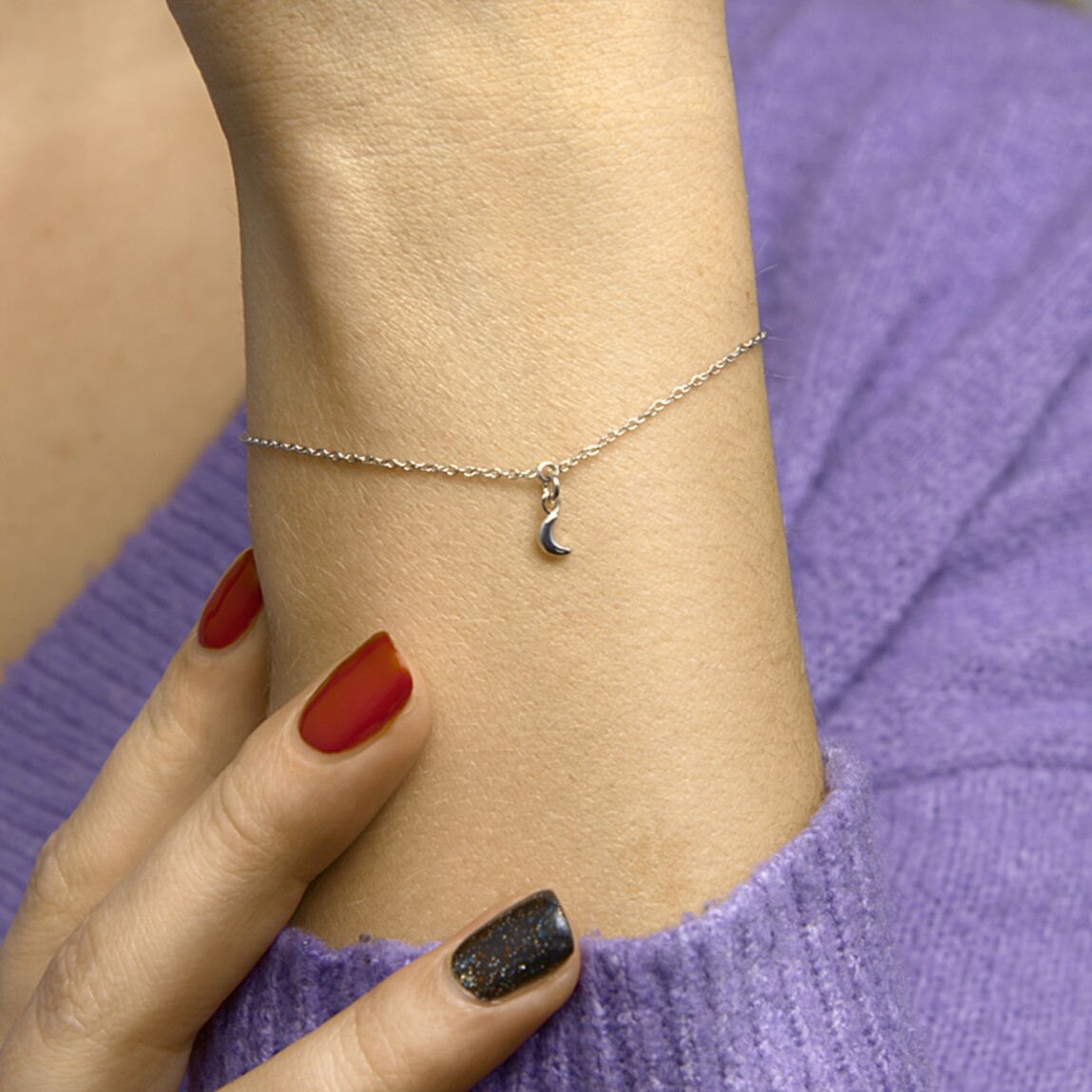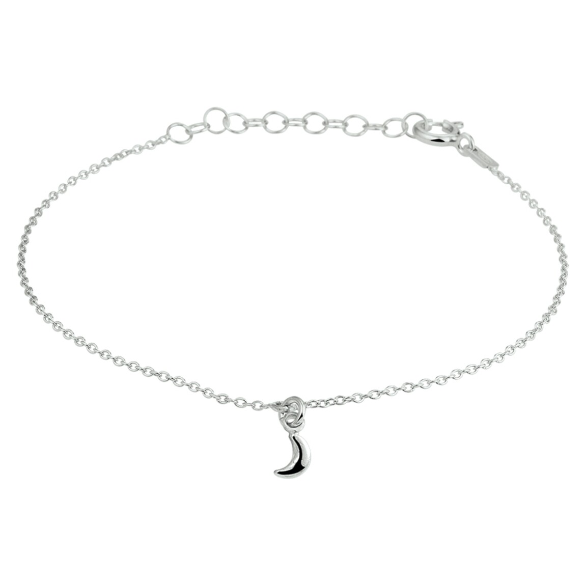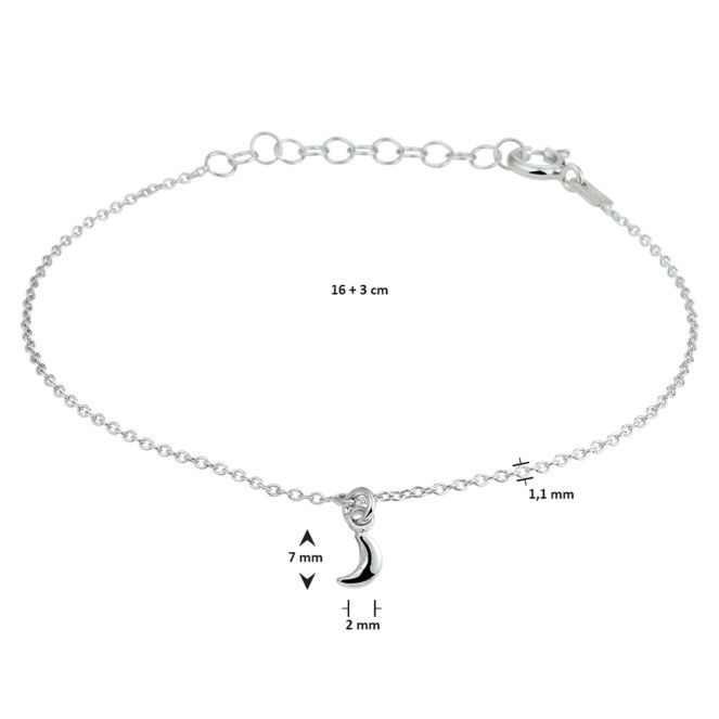 Gerhodineerd 925 zilveren armband uitgevoerd met een hangertje in de vorm van een maan. De armband heeft een draaglengte van 16cm met een extensie van 3cm. Het hangertje heeft een afmeting van 7x2mm.