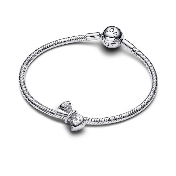 Deze stijlvolle chique Pandora bedel genaamd SPRANKELENDE STRIK zorgt voor lieve, warme, open uitstraling.