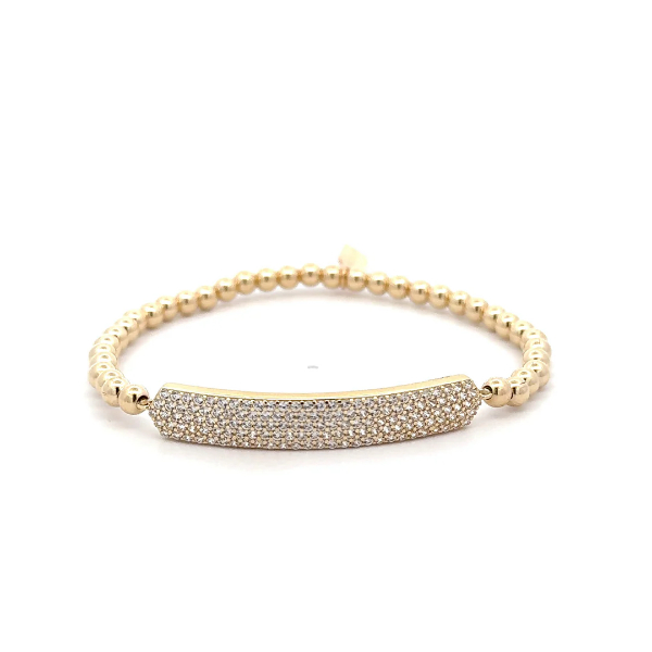 Deze armband van PScallme is gemaakt van zilver en een laagje goud. Het is een armband met goudkleurige balletjes en een grote bar bedel met zirkonia stenen.