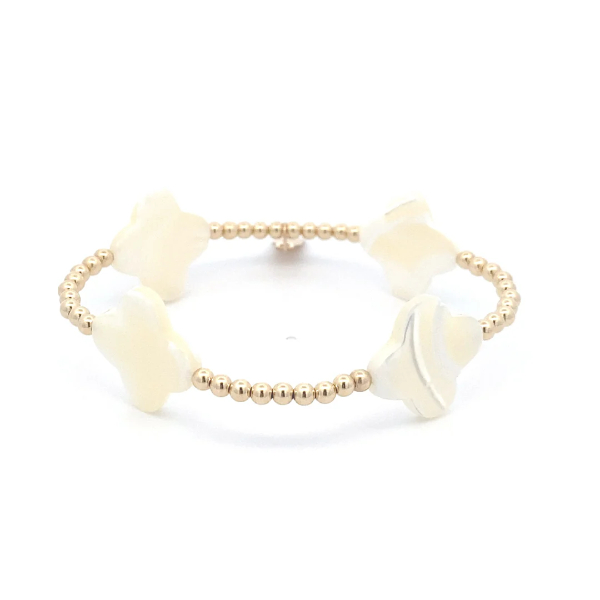Deze leuke armband van PScallme is gemaakt van zilver en een laagje goud. Het is een armband met goudkleurige balletjes en vier witte klavers die niet verkleuren.