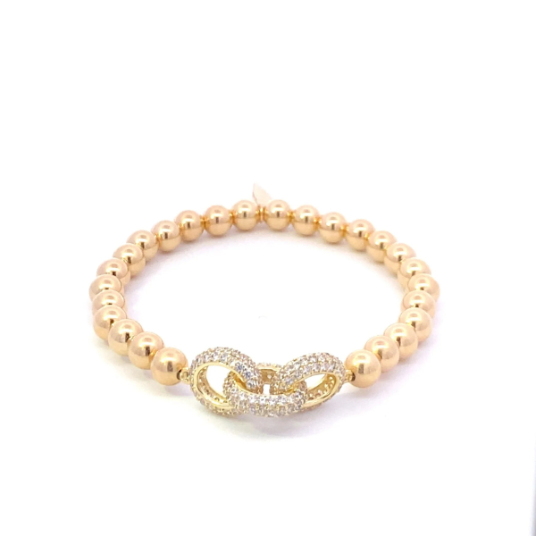 Deze armband van PScallme is gemaakt van zilver en een laagje goud. Het is een armband met goudklerige balletjes en een link-bedel met strass.