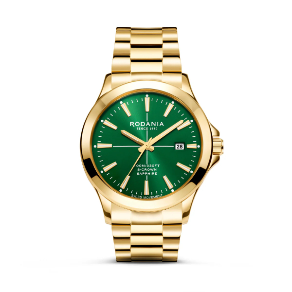 Deze stijlvolle Rodania komt uit de Verbier serie en is geïnspireerd door het alpenachtige terrein van de stad Verbier. Het horloge beschikt over een goudkleurige edelstalen band in combinatie met een groene wijzerplaat. Dit model is waterdicht tot 10 atm, wat het geschikt maakt voor dagelijks gebruik.