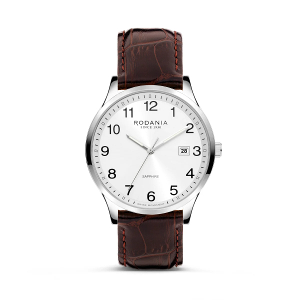 Dit horloge van Rodania beschikt over een bruine lederen band in combinatie met een zilverkleurige horlogekast en wijzerplaat. Het model is afgewerkt met een datumvenster op de 3 uur positie. Dit horloge heeft een waterdichtheid van 5 atm, wat het geschikt maakt voor dagelijks gebruik.