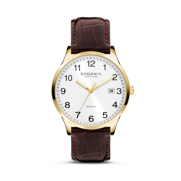 Dit horloge van Rodania beschikt over een bruine lederen band in combinatie met een goudkleurige horlogekast en wijzerplaat. Het model is afgewerkt met een datumvenster op de 3 uur positie. Dit horloge heeft een waterdichtheid van 5 atm, wat het geschikt maakt voor dagelijks gebruik.