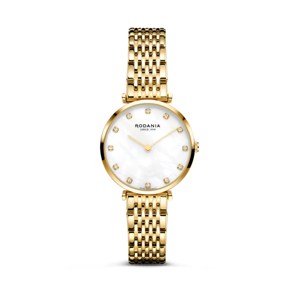 Dit stijlvolle horloge van Rodania komt uit de Lugano serie, vernoemt naar de gelijknamige stad in Zwitserland. Het horloge beschikt over een goudkleurige edelstalen band en kast in combinatie met een parelmoeren wijzerplaat. Het horloge wordt aangedreven door een quartz batterij uurwerk en is waterdicht tot 5 atm, wat het horloge geschikt maakt voor dagelijks gebruik.