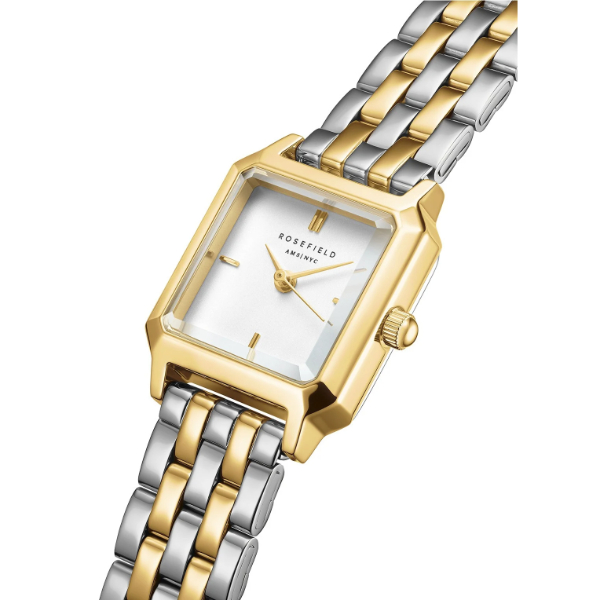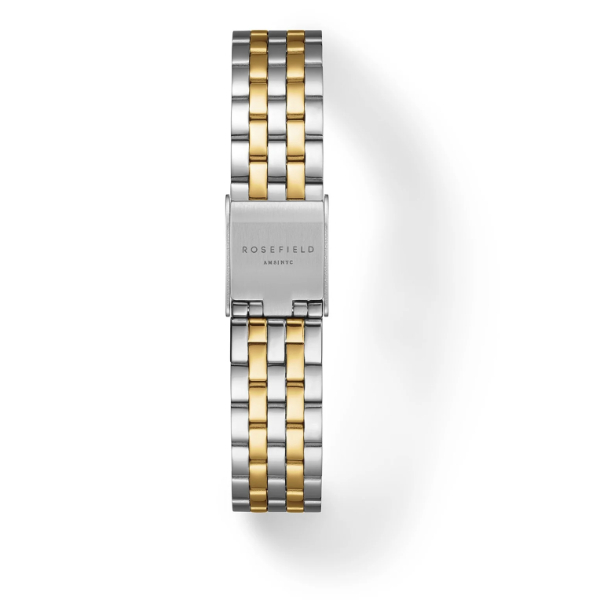 Deze stijlvolle Rosefiled beschikt over een bicolor gekleurde horlogeband in combinatie met een goudkleurige horlogekast. De zilverkleurige wijzerplaat is afgewerkt met goudkleurige indexen en het logo van Rosefield. Dit horloge is waterdicht tot 3 atm, wat het horloge spatwaterdicht maakt.