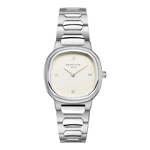 Dit stijlvolle Rosefield horloge beschikt over een zilverkleurige horlogeband en horlogekast. De Créme kleurige wijzerplaat is afgewerkt met zilverkleurige wijzers.