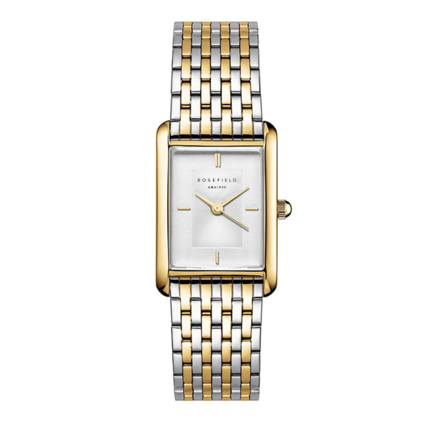 Deze stoere dameshorloge van Rosefield heeft een stijlvolle bicolor band. Het horloge heeft een diameter van 23,5 x 30,6 en heeft een zilverkleurige wijzerplaat. Het horloge is waterdicht tot 3 atm.