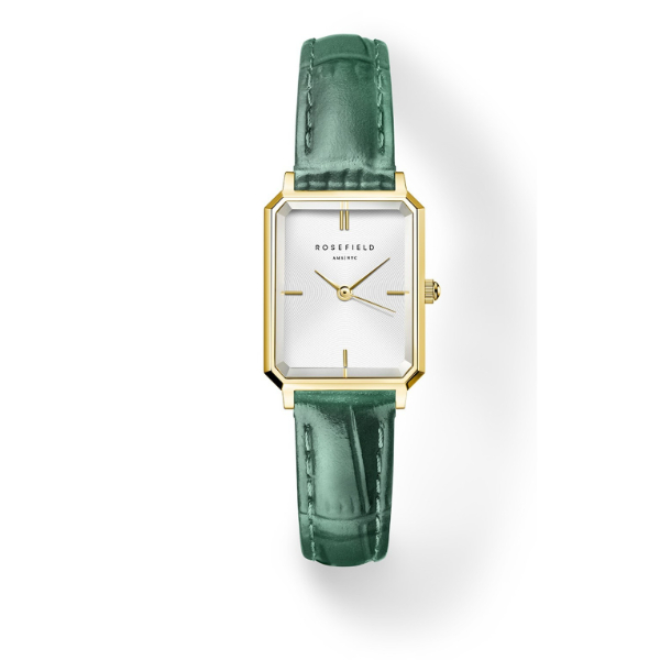 Dit stijlvolle Rosefield horloge beschikt over een groene lederen band in combinatie met een goudkleurige brass horlogekast. Het horloge is waterdicht tot 3 atm (spatwaterdicht)