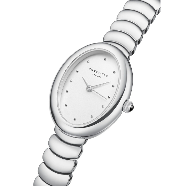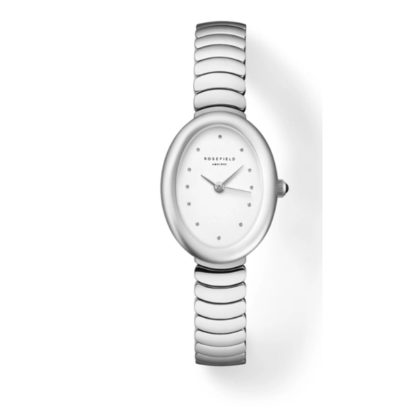 Dit stijlvolle ovale Rosefield horloge is gemaakt van edelstaal en brass. De zilverkleurige wijzerplaat is afgewerkt met zilverkleurige indexen en het Rosefield logo. Het horloge is spatwaterdicht.