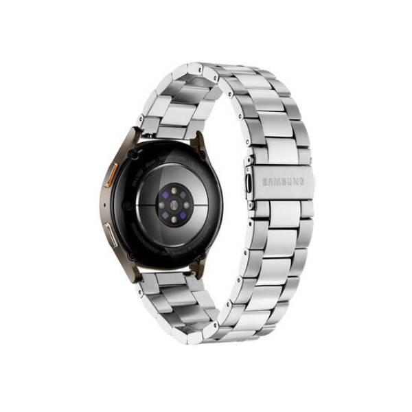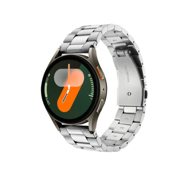De Samsung Galaxy Watch 7 is een elegante smartwatch in een ronde aluminium kast van 40 mm met zilveren stalen band. Hij combineert stijlvolle looks met praktische smart-features zoals hartslag- en stappenteller, meldingen, GPS, en is waterdicht tot 5 ATM.