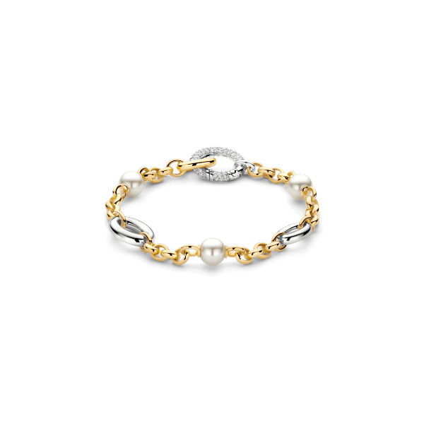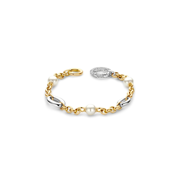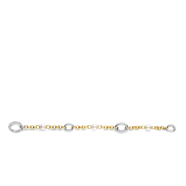 Deze mooie armband is gemaakt van 925 sterling zilver en is afgewerkt met een laagje geelgoud, parels en zirkonia.