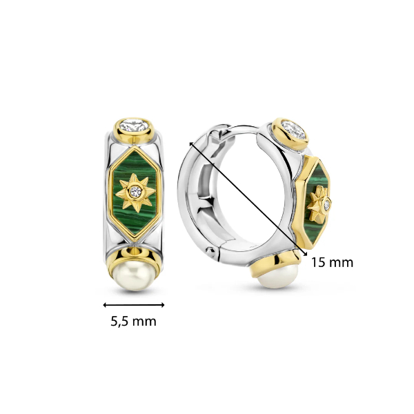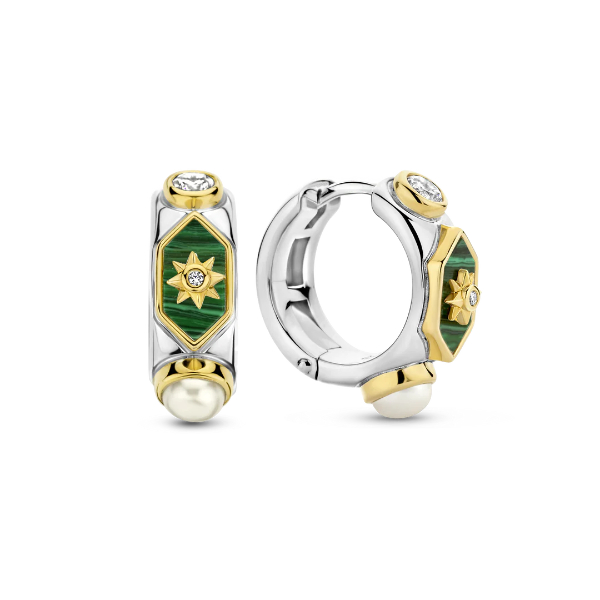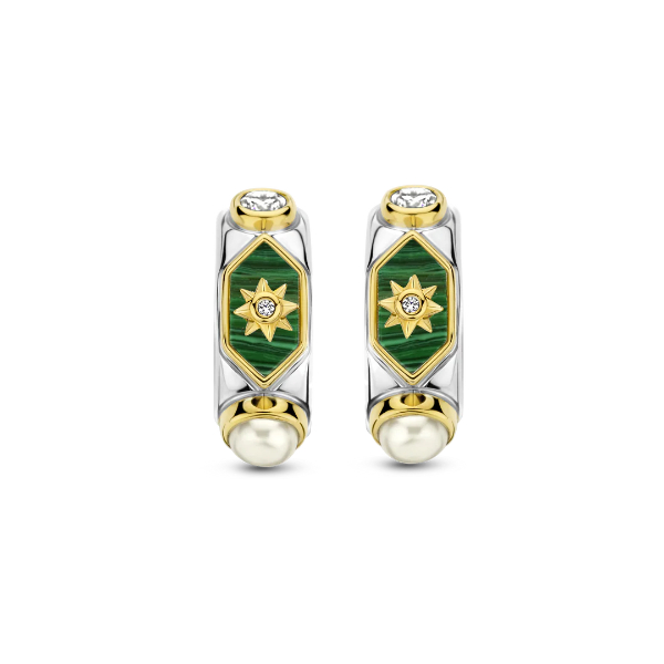 Deze prachtige oorbellen van TI SENTO zijn gemaakt van 925 sterling zilver dat is verguld met een laagje geelgoud. De creolen zijn afgewerkt met malachiet, parels en zirkonia.