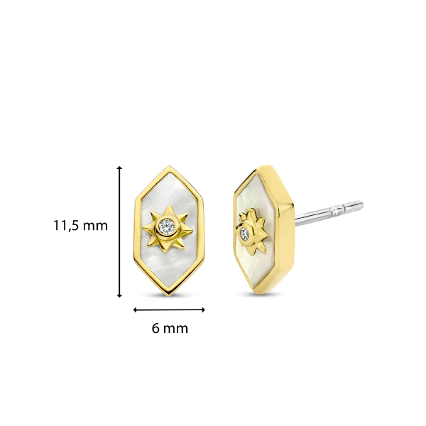 Deze prachtige oorbellen zijn gemaakt van 925 sterling zilver en verguld met geelgoud. De oorbellen zijn afgewerkt met parelmoer en zirkonia.