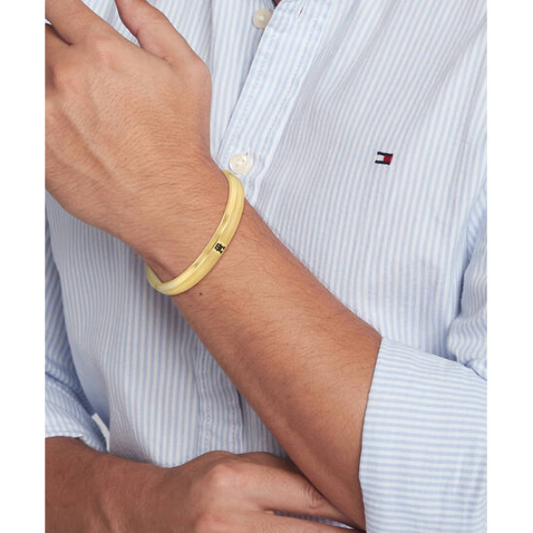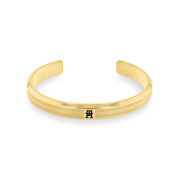 Deze stijlvolle Tommy Hifliger bangle is gemaakt van edelstaal en is verguld met geelgoud. Op de bangle is het Tommy logo te zien in het zwart.