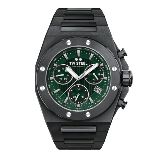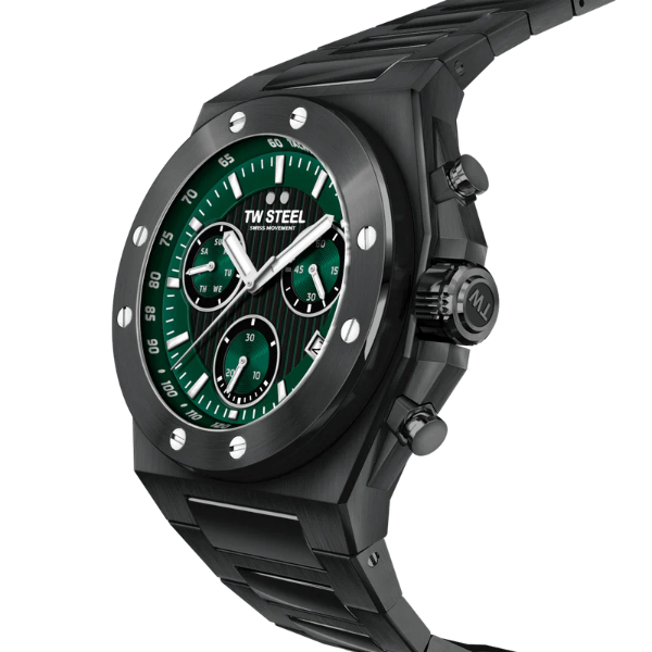 Deze stijlvolle TW Steel combineert klasse en sportiviteit in één horloge. Het model beschikt over een zwarte horlogeband en kast in combinatie met een groene wijzerplaat. Het horloge is waterdicht tot 10 atm en is geschikt om mee te zwemmen.