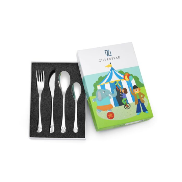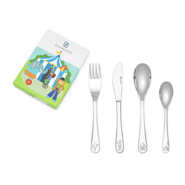 Deze mooie bestekset van Zilverstad heeft het thema circus. Het is mogelijk om de bestekset te graveren met een naam, datum of initialen.